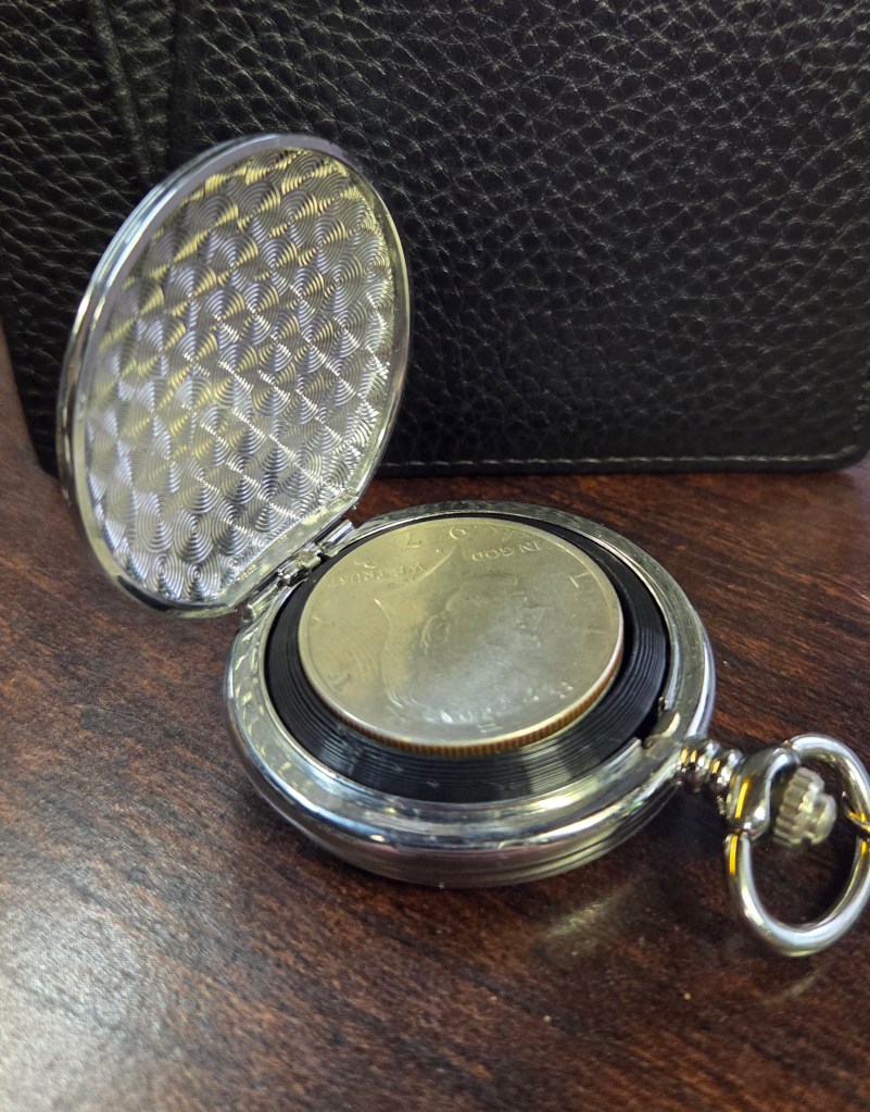 A beautiful pocket watch packed full of magical secrets! Predict/reveal cards with the watch face! Small object to impossible location, INSIDE THE WATCH! Use the watch to store 4 half dollars! (with shell depending on set, not guaranteed)